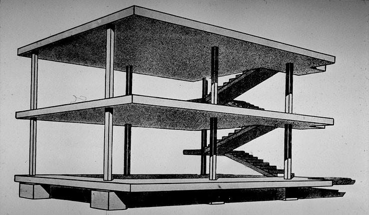 コルビュジェが、当時最先端の大量生産技術であったT型フォードの生産ラインに刺激を受け、それまで手工業に甘んじてきた建築の生産に、大量生産の技術と美学を持ち込むことで、大きく変革しようとした試みといえるだろう。矩形のスラブの間に均等に同一の柱が並ぶ様子を見れば、今日のオフィスビルや商業ビルの多くが、依然としてこの100年前に提示された、大量生産の美学に支えらえたモデルの延長線上にデザインされ、生産されていることは、簡単に分かるだろう。