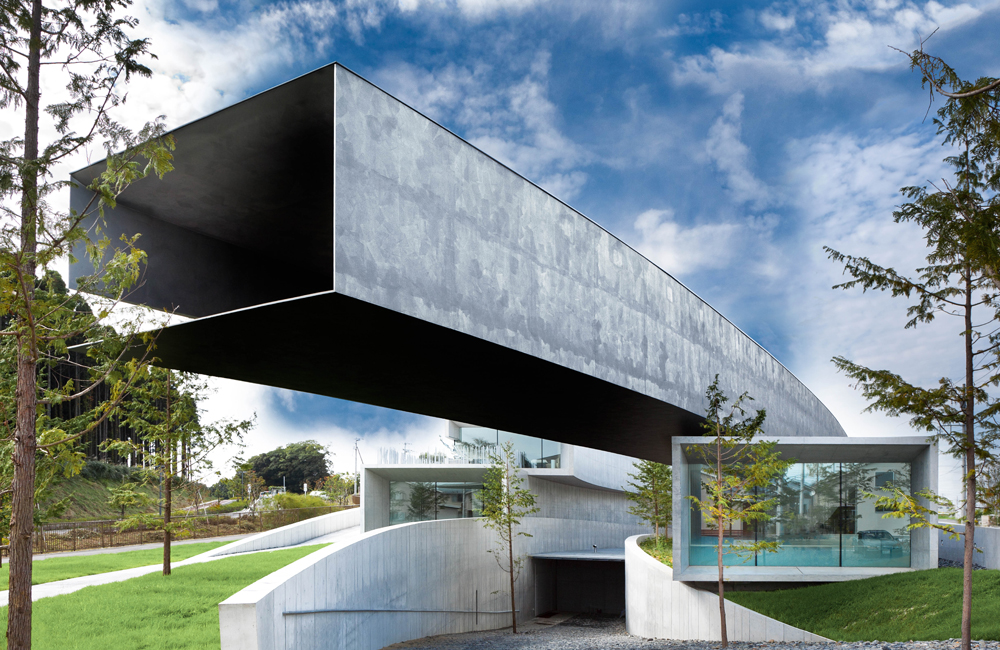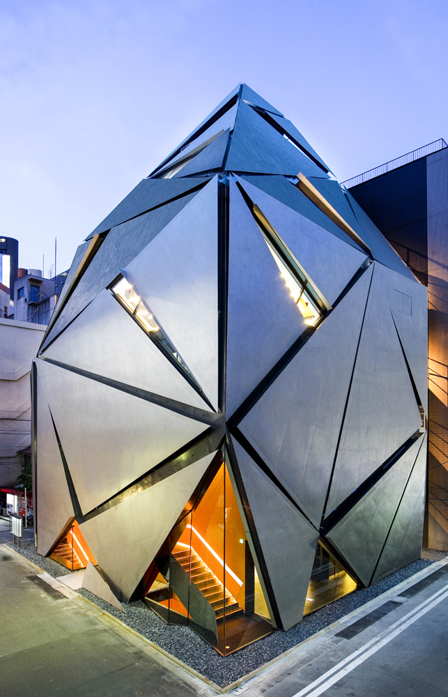 2つのシアターからなる施設で、外観は、日本の厳しい斜線制限の中でどのような形態であれば延床面積を最大にできるかを目標として、コンピュテーショナルな手法で「生成」した。構造はRCであるが、外装の三角形に張られた鉄板が地震エネルギーを吸収するダンパーとして働くことで安全性を高めている(写真1)。