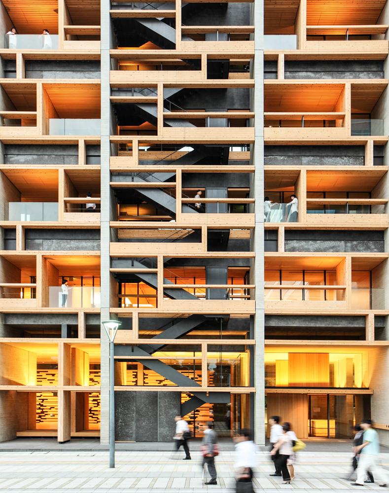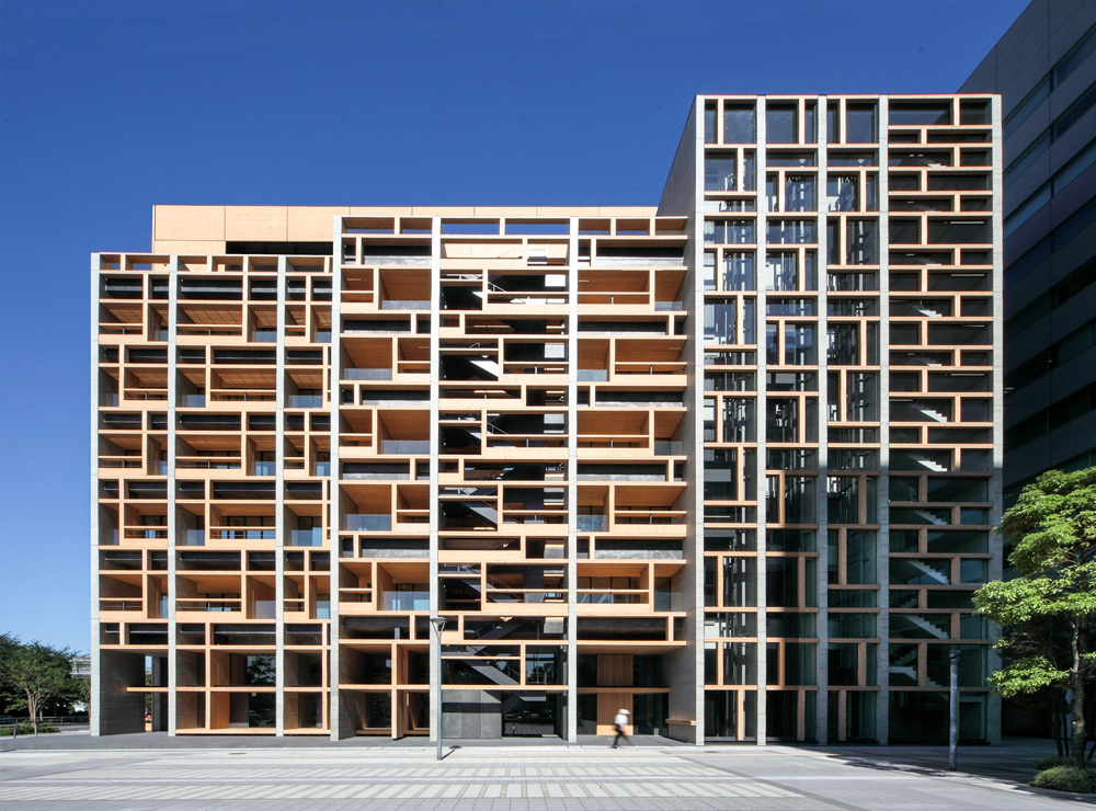 バルコニーのスラブと柱、さらにはそこに加えられた木製の竪庇の組み合わせが、彫りの深い特徴的なファサードが生んでいるが、これは同時に日本の強い西日を遮るシェードともなっている。常時は縁側のようにオフィスで働く人々の憩いの場であり、火災時などの非常時には安全性の高い避難ルートとなっている。