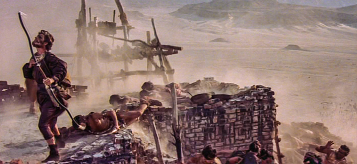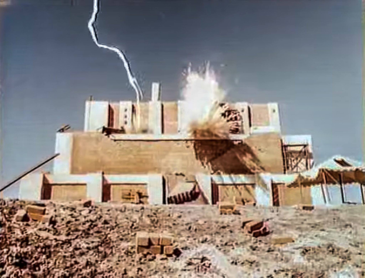 ▲写真3:映画「Greatest Heroes of the Bible」の、バベルの塔の倒壊シーン。こちらではもはや旧約聖書の記述を逸脱して、神の怒りの象徴である落雷が派手にバベルの塔本体を破壊している。(クリックで拡大)