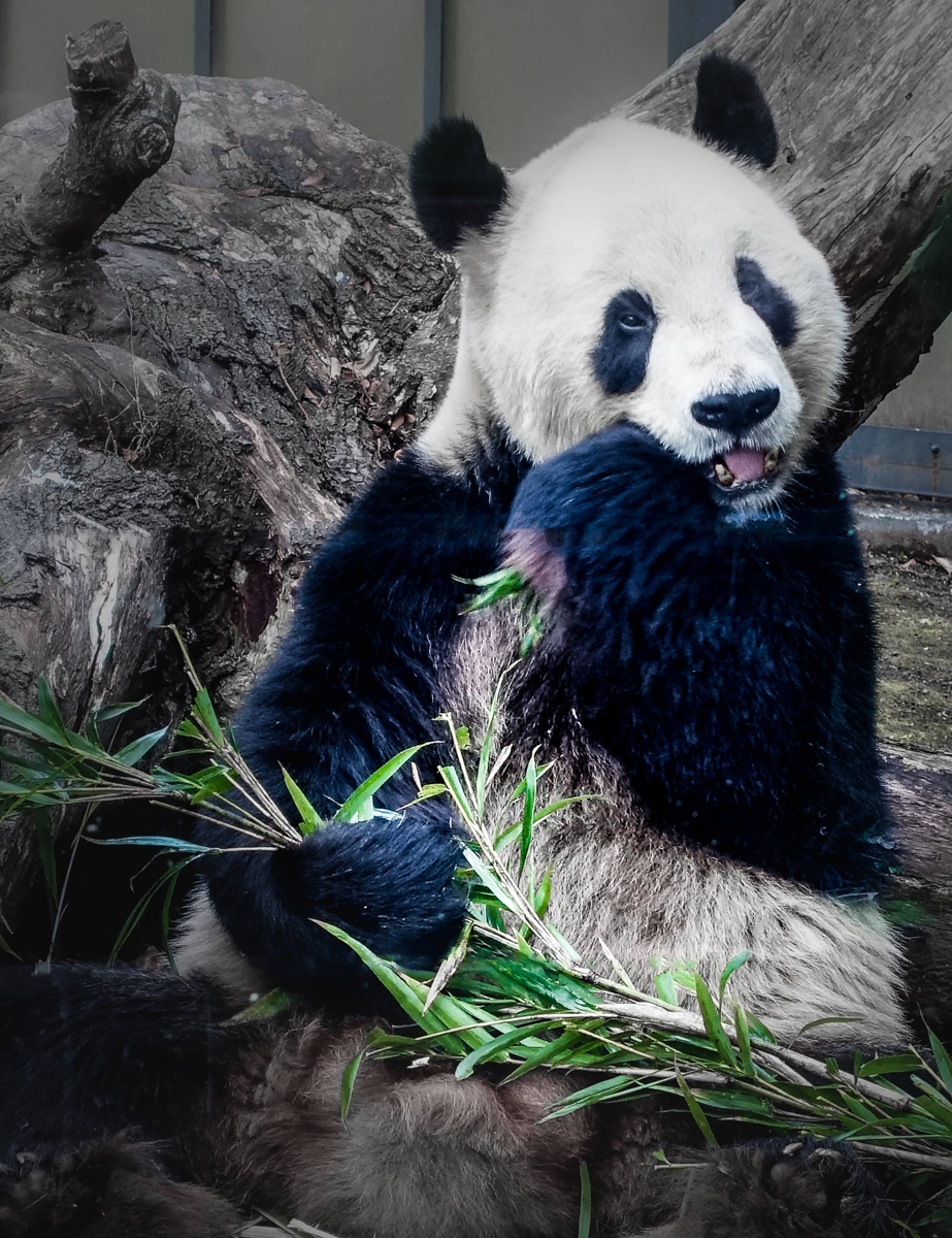 特徴ある白黒の塗分け、特に目の周りをグルリと囲む黒い斑は、遺伝と淘汰の結果であろうが、パンダを実際の顔つき以上に可愛く見せている(女性のメイクのよう?)。また、竹を長時間食べているのは、そのずんぐりとした4頭身の体型に収まっている胃腸が竹を消化吸収するためにはいささか短く、このためパンダは1日の大半竹を食べ続ける必要があるからだという。