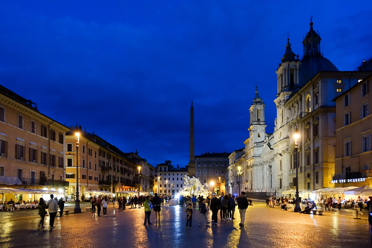▲写真1:ローマの代表的な広場の1つ、ナヴォーナ広場。夜でもたくさんの人々が集まり、にぎわっている。でも日本の街づくり、建築づくりによりヒントを与えてくれるのは、広場と広場をつなぐ通りなのではなかろうか。(クリックで拡大)