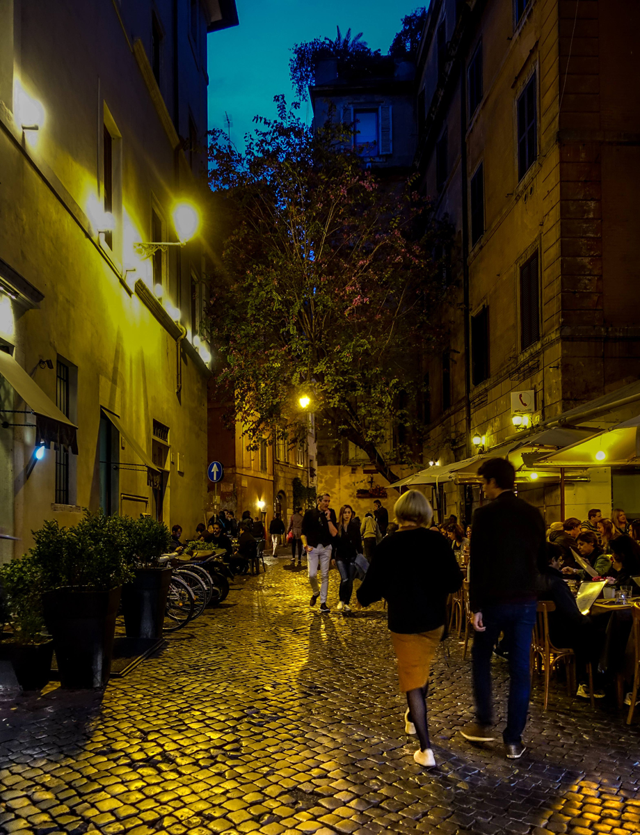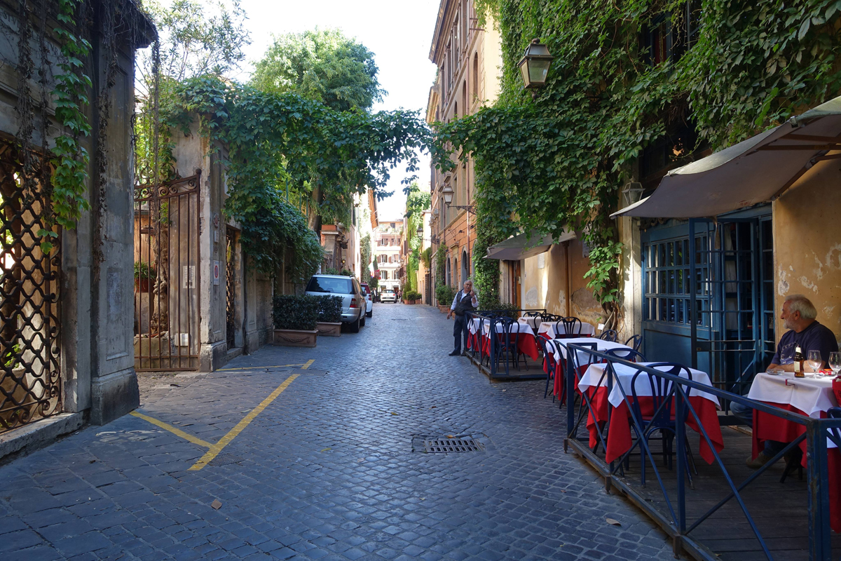 おそらくこの通りは、自動車誕生前につくられ舗装されたものであろうから、車道や歩道の区別が無くて当たり前。人間の道に舗装がなされ、やがて馬車が通り馬車と人間の共存が始まり、やがてそこに自動車が加わって、共存関係はより重層的なものとなった。おそらくは、ピンコロの舗装や道路に飛び出したレストランやプランターボックスの存在が、自然発生的なボンネルフ(道路にバンプなどの障害を設け、通過する自動車の車速を落とし、歩行者と自動車が共存できる道路空間をつくる、1970年代のオランダで生まれた街づくりの手法)となって働いているのだろう。ローマの裏通りは、歩道として、前庭として、レストランとして、駐車場として、そして車道として、同時に複数の役割を共存共栄させて、その魅力を放っている。