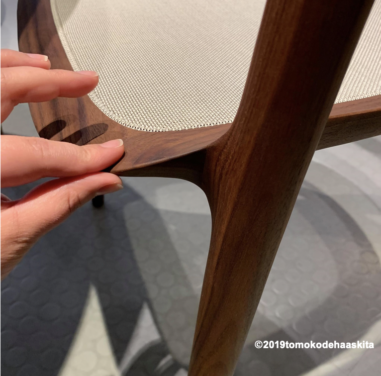 新たな可能性を見出して検証し、進化に貢献する研究者のように、イノベーティブにデザインを探求し続けることが求められるミラノ。無垢材の家具が進化したと感じさせる、ミラノだからこそ生まれた「DC10」のフレームの構造とメッシュの座面を見てみましょう(写真2、3)。
