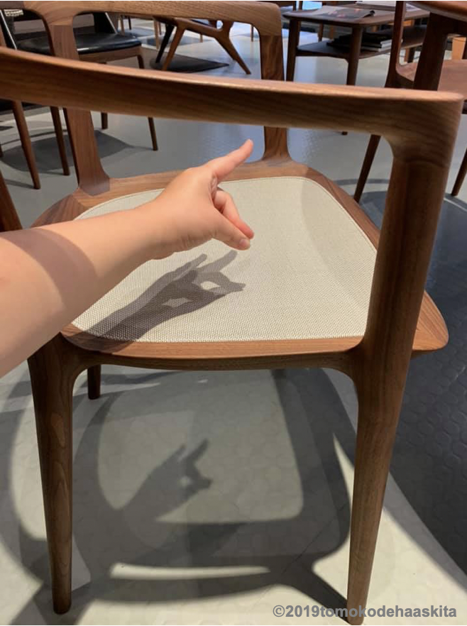座面には木材は使われておらず、フレームに張られたメッシュのみが座面となっています。このため、当然ながらこの椅子は光を通します(写真4)。手をかざすと、その影がフロアーに映り、この光と影を扱うINODA+SVEJEの感性にさらに驚かされます。