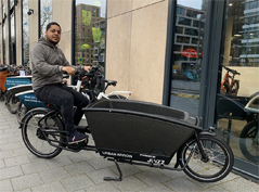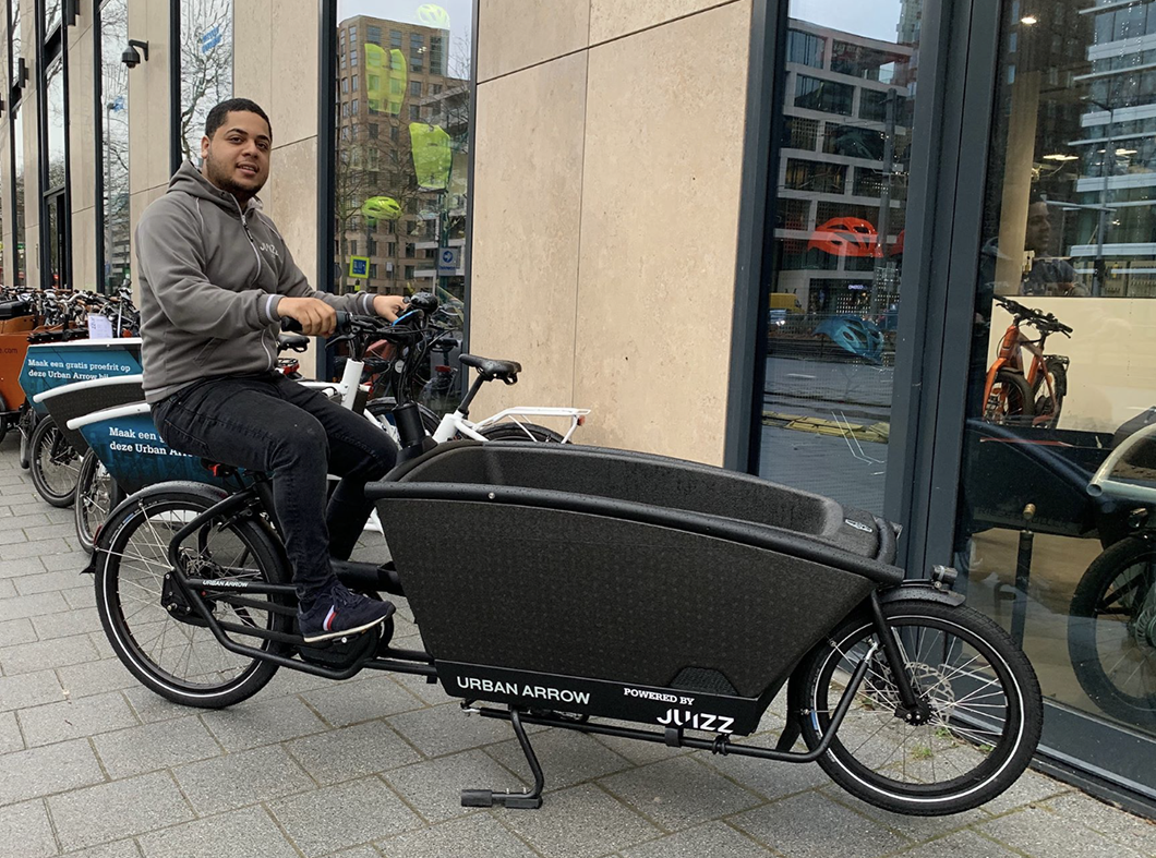 JUIZZの一番の売れ筋のUrban Arrow社の電動バクフィッツに試乗したところ、始めの踏み込みの際ペダルに重量感じるものの、二輪にも関わらず重心が安定しており、自転車初心者でも乗りこなせました(写真4)。ハンドルは、重いものの左右にブレにくいと感じました。