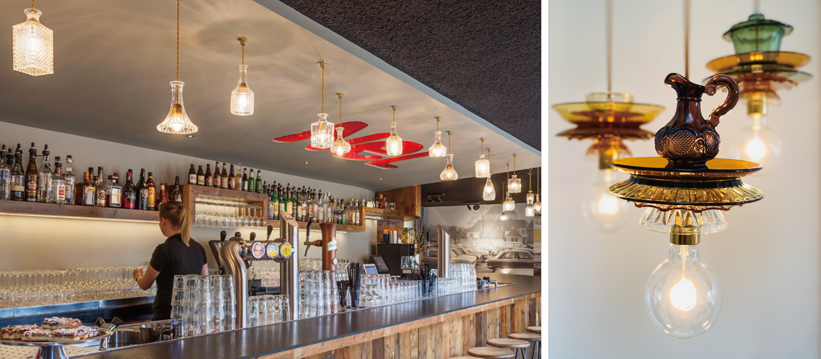 シェリル氏は、その空間のストーリーを伝える照明をデザインすることを得意としており、オフィス機器や、楽器、鏡など、安価なビンテージ品やセカンドハンド品をマーケットやチャリティーショップなどで探し出して、場所の背景を物語る照明を製作しています。バーのために製作した、さまざまな形のクリスタルのウィスキーデキャンタでできた照明は、その表面の凹凸がキラキラと光を反射させ、年代物のお酒を味わう楽しみを深めてくれる大人の空間を演出しています。(写真1)