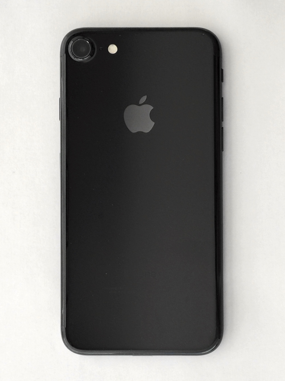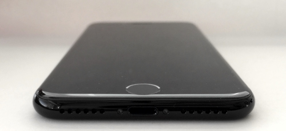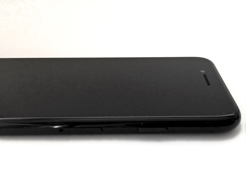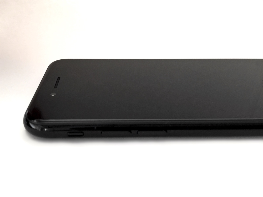 ◀本体とガラス面の間のわずかな段差をiPhone 6 / 6sよりもさらに減らして平滑度を増したボディは、既存のどのモデルよりもモノリス的な印象を受ける。ただし、自前の写真では公式フォトのようなジェットブラックの滑らかさを表現することは難しい。(クリックで拡大) |