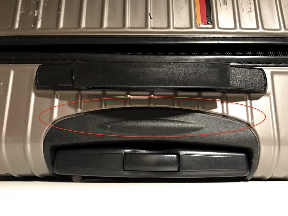 ◀たとえば、樹脂ボディのリモアのサルサは、ジッパーに近いハンドルを持つ頻度が高いと、赤で囲んだ段差の部分に繰り返し張力が加わって経年劣化を起こしやすく、最終的に破断してしまう。(クリックで拡大) |