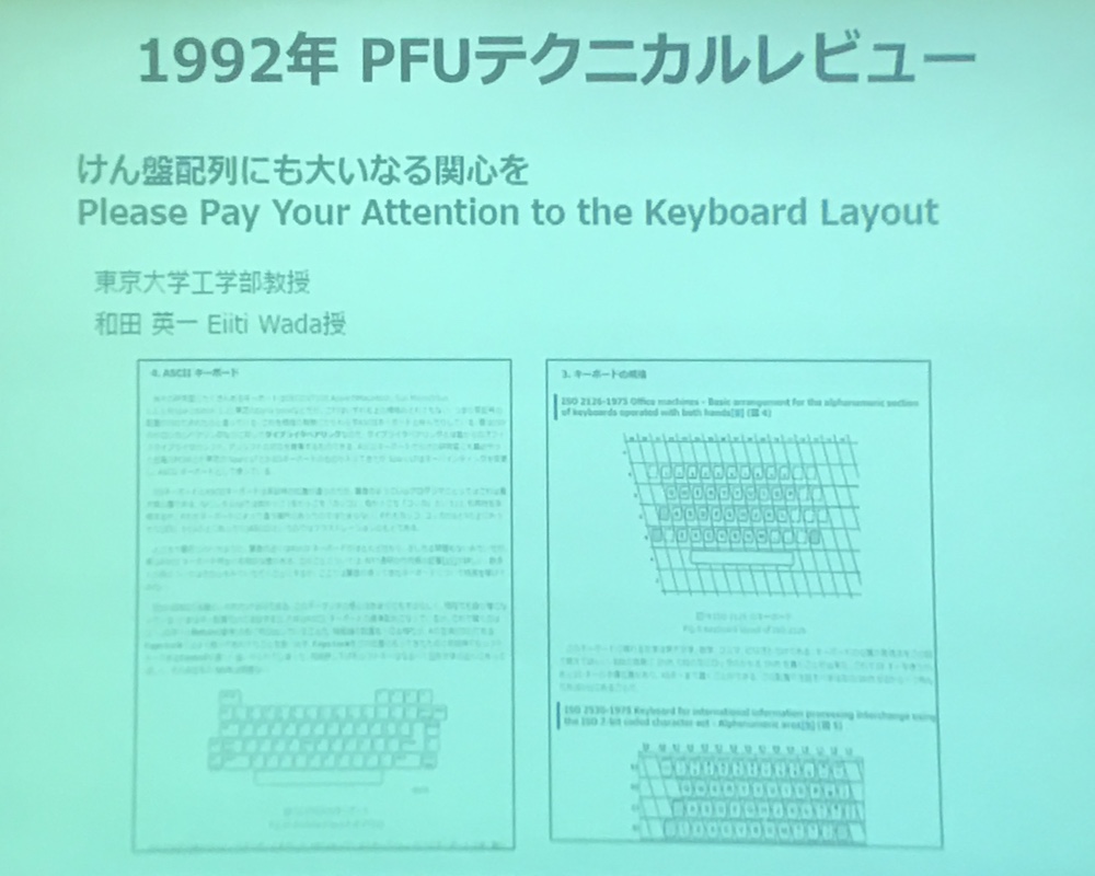 中でも注目を浴びたのは、キーボードはコンピュータ製品に添付された純正品を使うことが当たり前だった時代に、マシンを変えても同じキー配列で快適に利用できるような最適かつ最小構成の汎用キーボードを発案し、後のHHKBをPFUと共同開発することになった、和田英一 東大名誉教授のお話である。