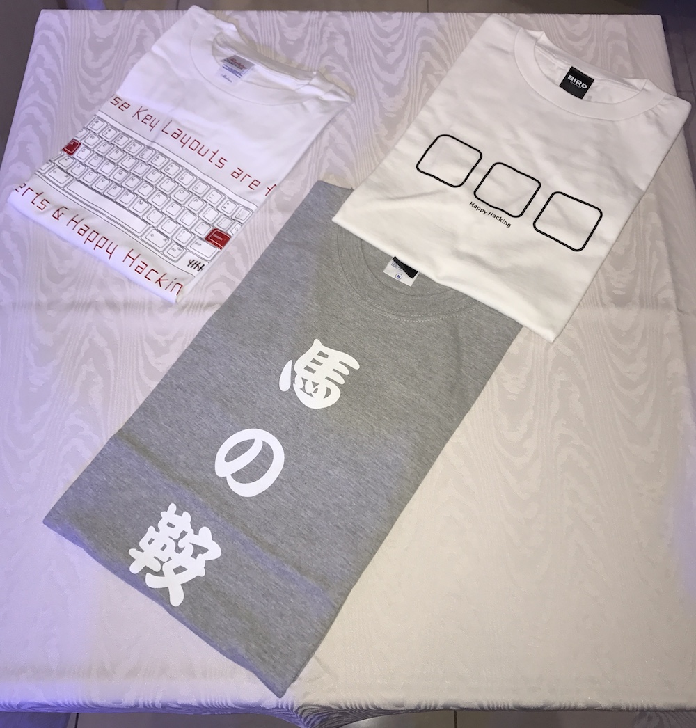 ◀歴代のプロモーション用Tシャツ。マニアックな無刻印キートップや、かつて和田氏が語った「カウボーイは、馬を変えても使い慣れた鞍は使い続けた」というエピソードにちなむ「馬の鞍」の文字などがあしらわれている。(クリックで拡大) |