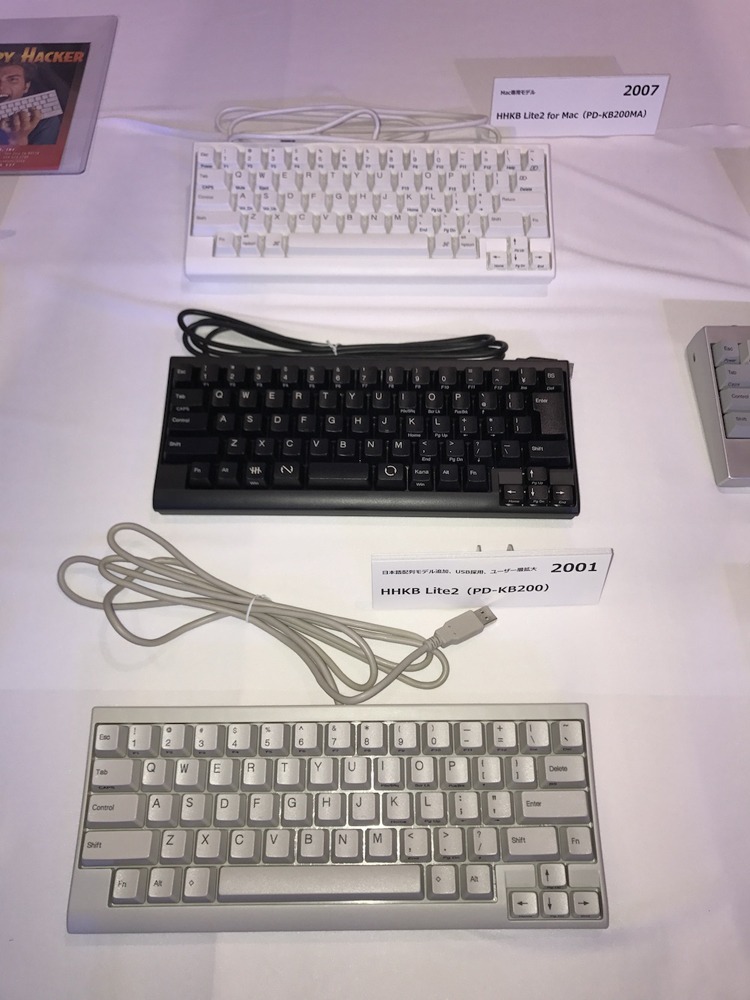 ◀初期のHHKB。一番手前が初代モデルで、真ん中がそのMac対応版。一番奥は非売品の漆塗りモデルだが、これが後のJAPANモデルへとつながっていく。(クリックで拡大) |
