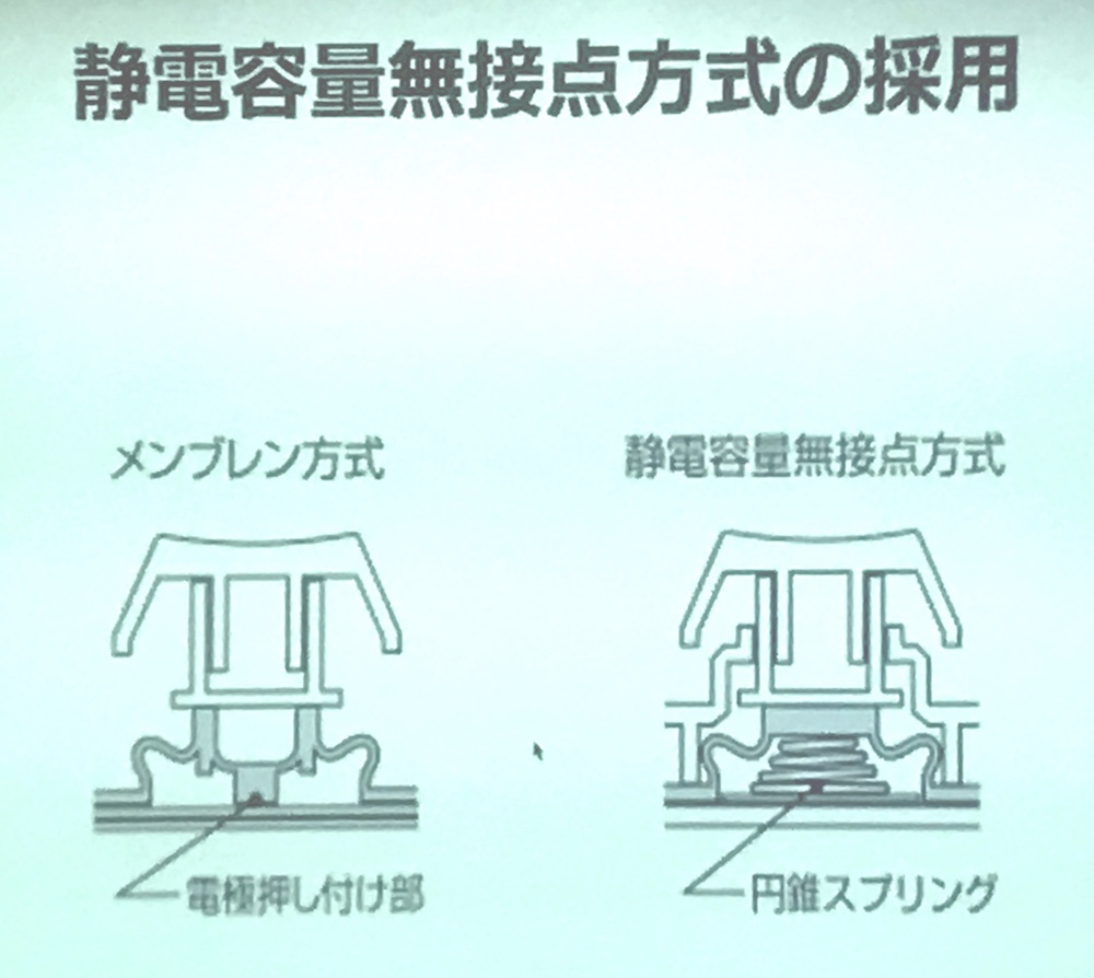 ◀Professionalに採用された静電容量無接点方式のキーメカニズムは、優れた打鍵感と耐久性を高いレベルで両立させた。しかし一方では、機構上、消費電力がやや多くなるため、ワイヤレス化を阻む要因ともなった。(クリックで拡大) |