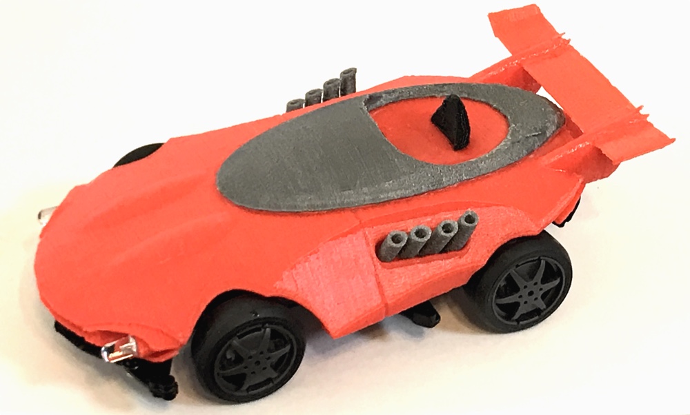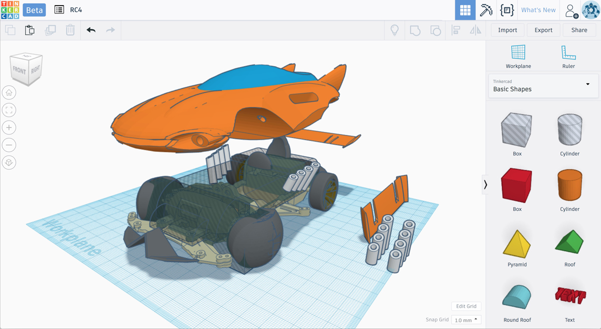 ◀TinkerCADは、立方体や球、円錐などの基本的な形を組み合わせることによって、積み木のように造形していく手法を採用。単純な形の組み合わせでも、スポーツカーのように躍動感のあるボディをデザイン可能だ。(クリックで拡大) |