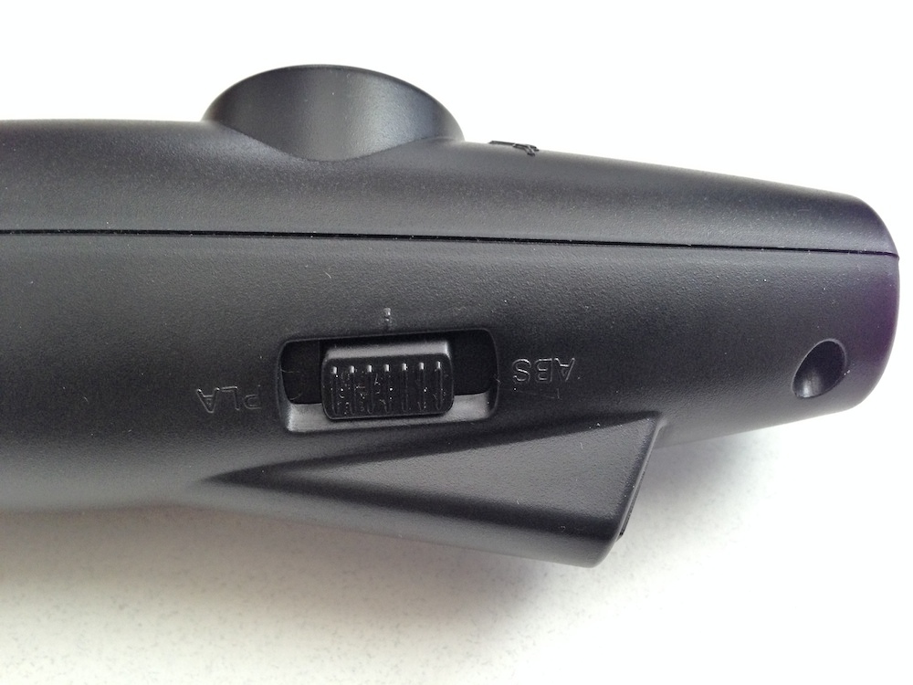 ◀電源スイッチは、溶解温度の異なる樹脂の種類(ABSかPLA)に合わせてスライドしてオンする仕組みだが、刻印の向きが上下逆のように思える。(クリックで拡大)