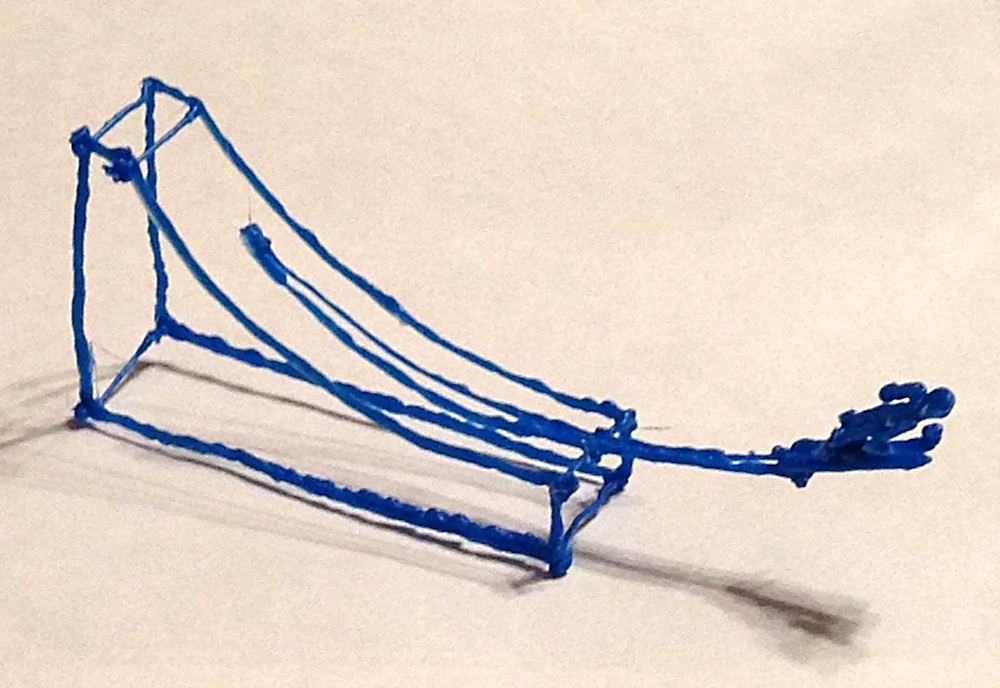 ◀スノーボードのハーフパイプも作ってみた。他のものも含めて主な部分は平面で作って合体しているが、螺旋状の軌跡の造形などは、そのまま空中に描いて固化させたものだ。(クリックで拡大)