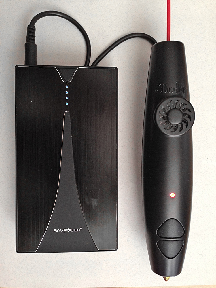 ◀本来はAC電源で動かすべき製品だが、大谷は、どこでも造形やデモができるように、15,000mAhの大容量モバイルバッテリーと組み合わせて利用している。(クリックで拡大)