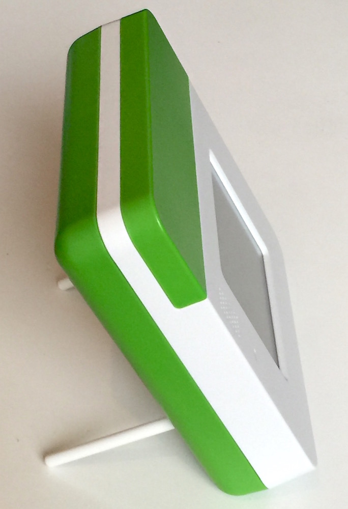 既存のカテゴリーに当てはまらない製品なので前置きが長くなったが、まず外観の正面は、頭でっかちの液晶テレビのようにみえる。これは、後述するように、緑のカバーの内側がセンサー類の取り付けスペースとなっているためだ。