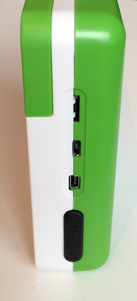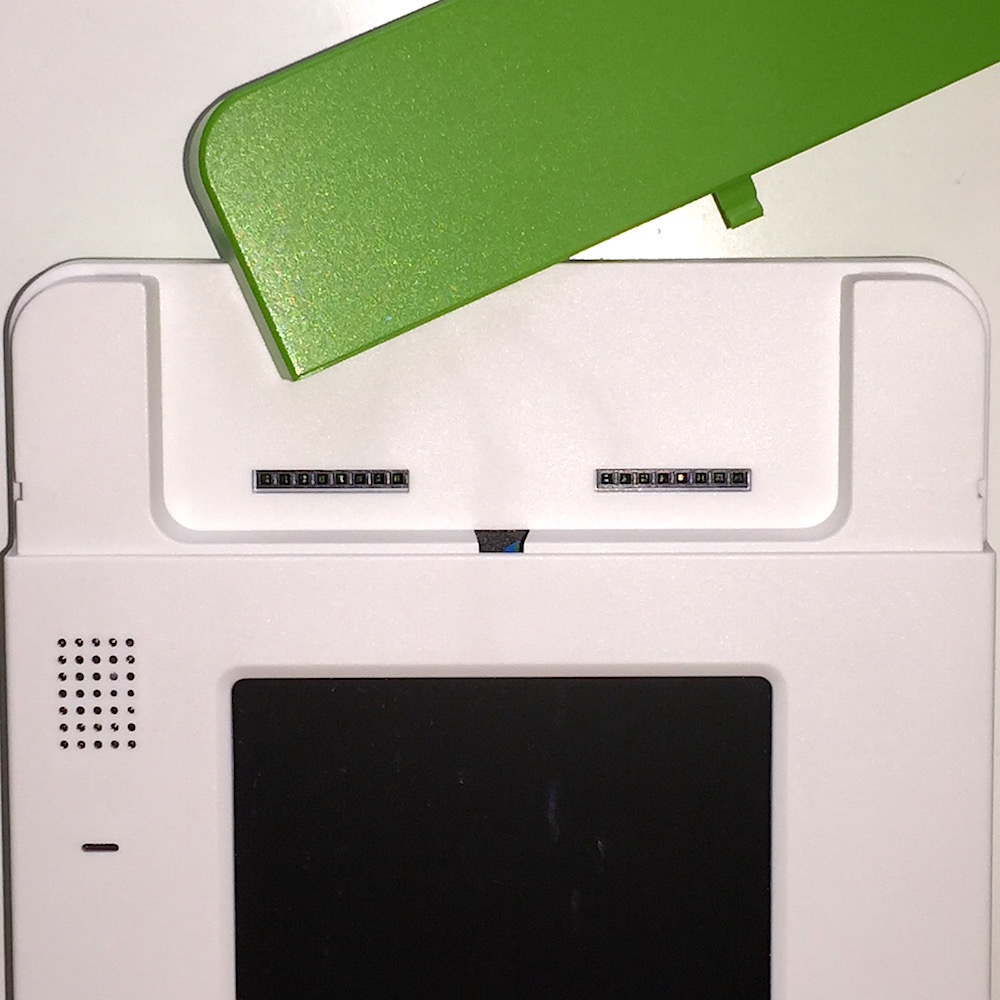 ◀左右の穴は、電源ボタンのすぐ下にはめ込まれた2本の白い棒を外して差し込むことで筐体を傾けて利用したり、別の機器のコントローラー的に利用する際の固定に使うためのものだ。(クリックで拡大)