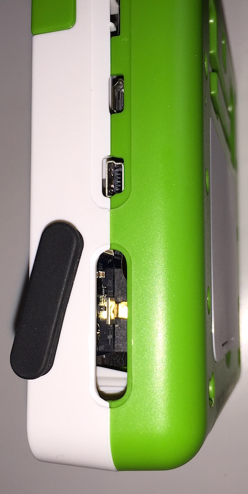 側面には、microSDカードスロットや、入出力・充電用のUSBポートがあり、さらに、内部からセンサーケーブルを取り出すための開口部(ラバーキャップが付いている箇所)も備わっている。つまり、正面や背面のスロットも含めて非常に拡張性に富み、スタンドアロンでも機能できるポケットワンボードコンピュータだと考えることもできる。