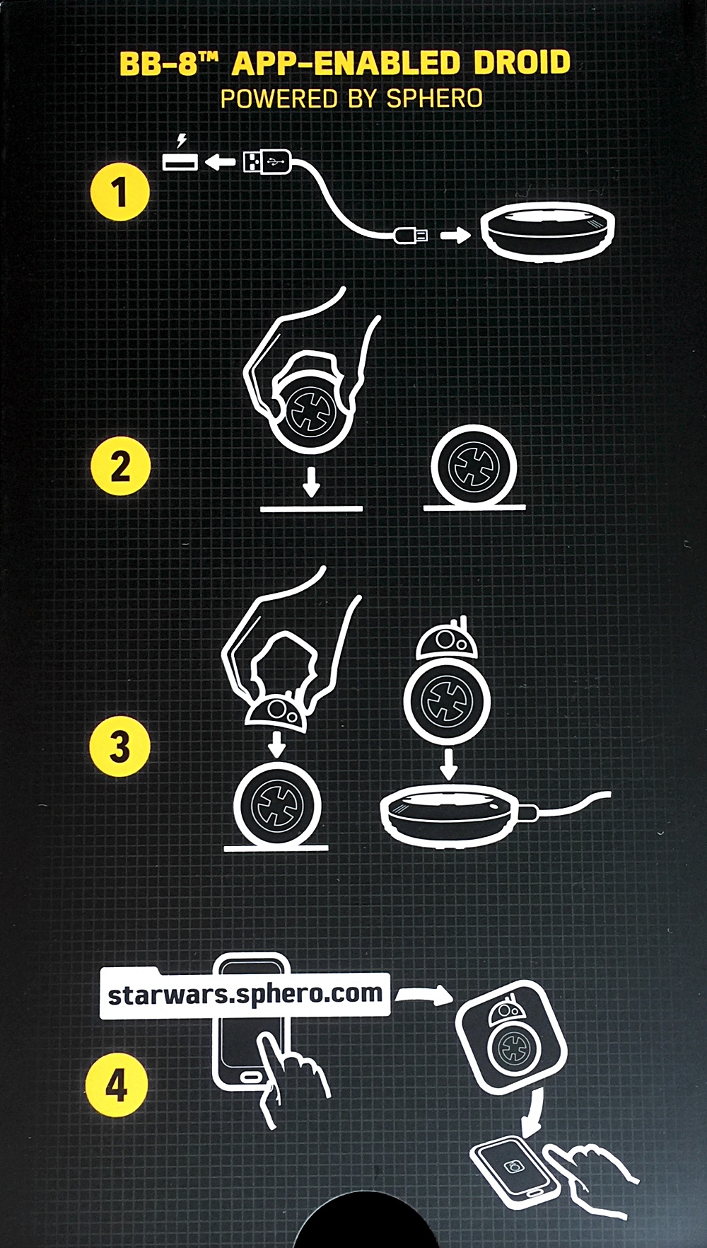 ◀Spheroのロゴが印刷された黒い紙の裏面はクイックスタートガイドになっており、タイトルとURL以外はイラストのみでセットアップ手順が説明されている。(クリックで拡大) |