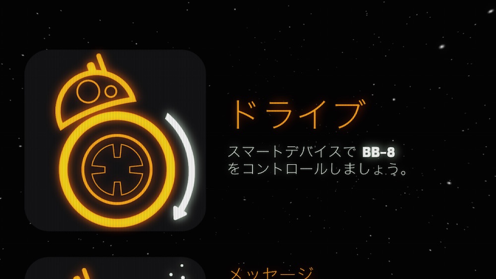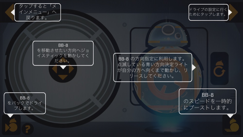 ドライブモードでは、BB-8を画面上のジョイパッドを利用して自在に走行させることができ、頭部の向きを通常とは逆にした後ずさりのような走りや、一時的な速度のブーストも楽しめる。