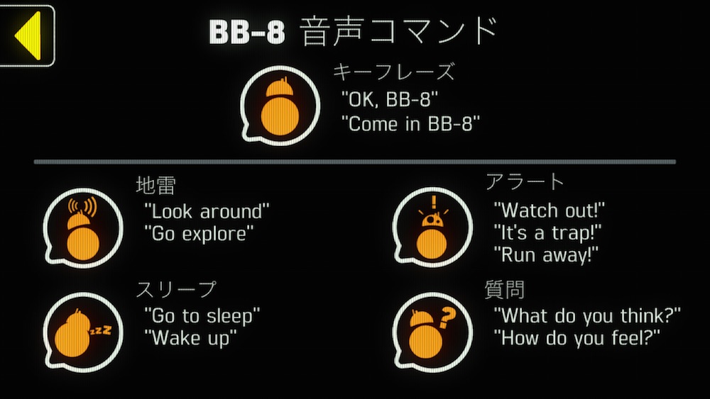 ◀設定画面からは、ボイスコマンドによるコントロール機能(現時点では英語のみの対応)をオンにすることもでき、キーフレーズによるアクティベーション後に各種のコマンドを発して、BB-8に反応させることが可能だ。(クリックで拡大) |