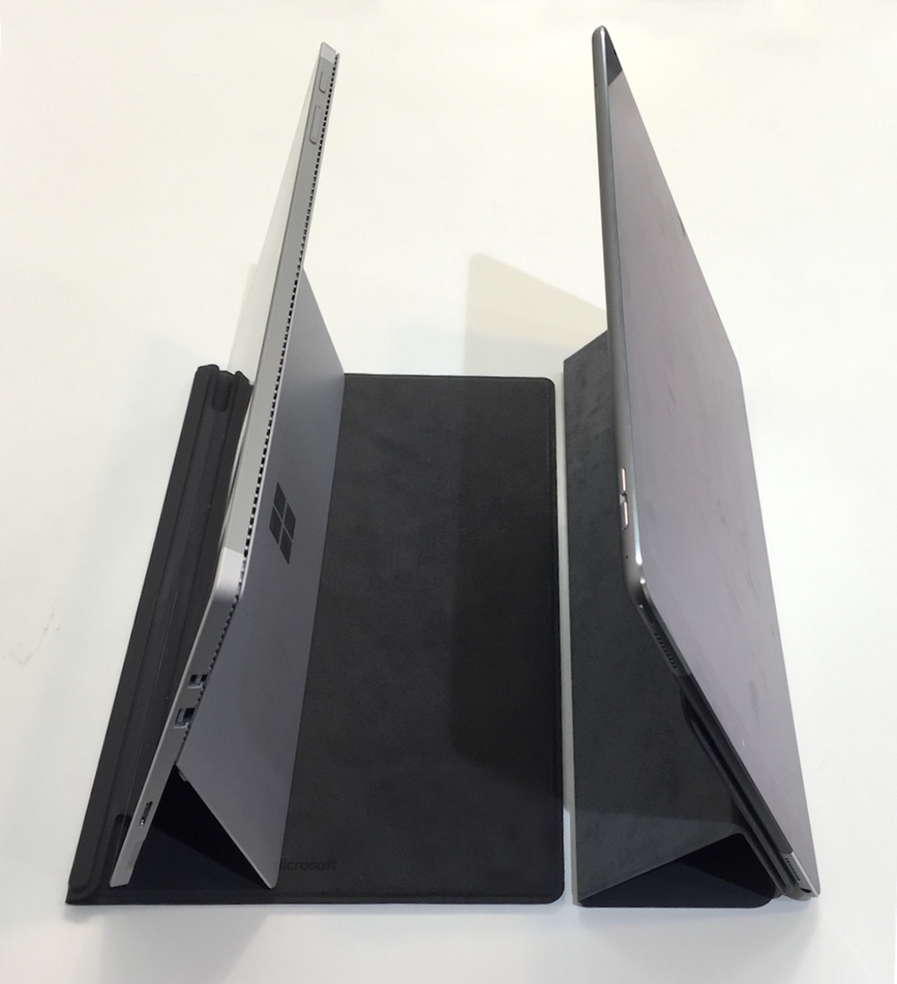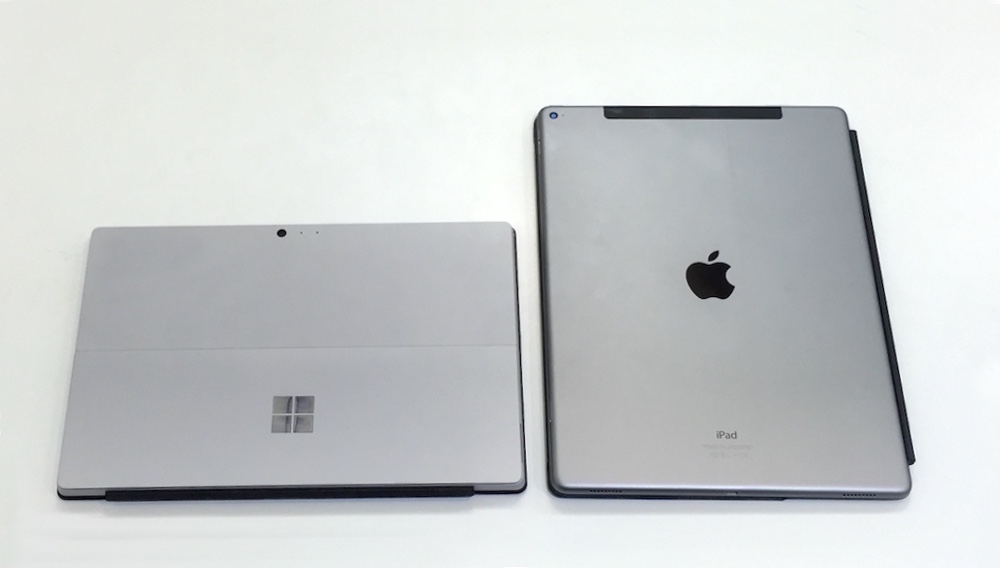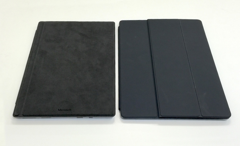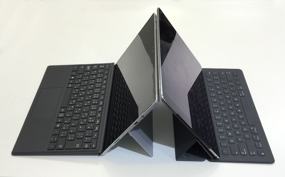 ◀参考までにSurface Pro 4(左)と並べたiPad Pro(どちらも、専用のキーボード内臓型カバーはオプション)。iPad Proのカバー(Smart Keyboard)に段差があるのは、そこから右側の部分にキーボードが位置しているためである。(クリックで拡大) |