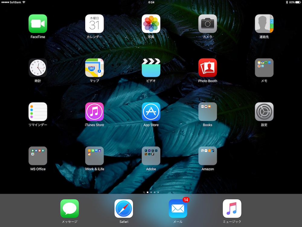 ◀iPad Proの画面は12.9インチで2,732×2,048ピクセルと巨大だが、ホーム画面のアイコンの表示数などは他のiPadモデルと変わりない。サイズの異なるiPadを使い分けた場合でも、違和感なく使えるようにするためと思われる。(クリックで拡大) |