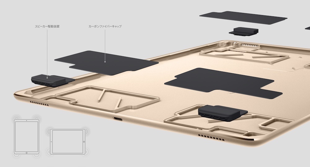 タブレットデバイスであるiPad Proは、必要に応じて縦使いと横使いを切り替えながら利用されることが多い。そこで、アップルは、どちらの状態でもステレオサウンドの再生に違和感がないように、スピーカーを四隅に搭載し、向きによって自動的にそれぞれの役割が変化する仕組みを作り出した。