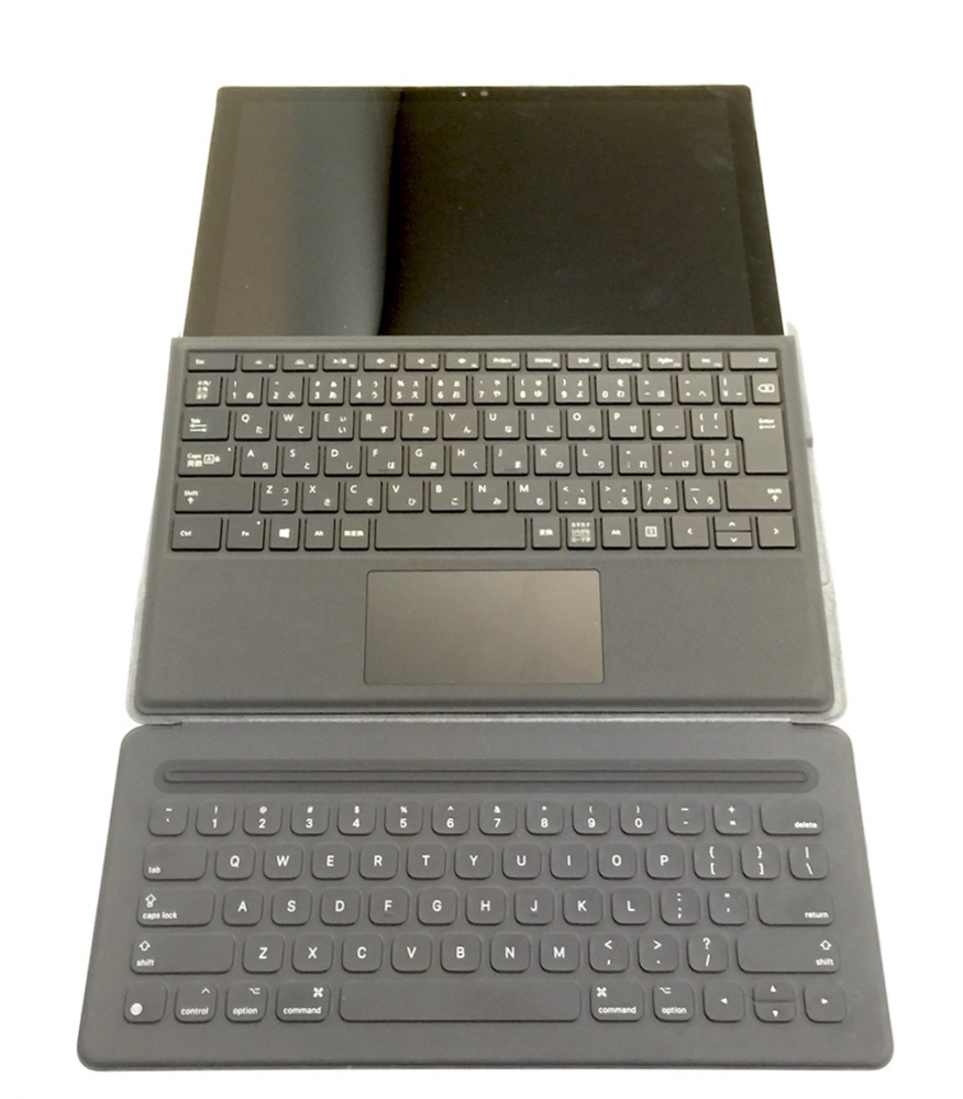 ◀Smart Keyboard(下)は、ファンクションキーやトラックパッドのようなポインティングデバイスを内蔵しないため、たとえばSurface Pro 4のもの(Type Cover)と比べてコンパクトにまとまっている。(クリックで拡大) |