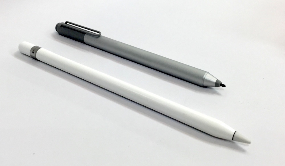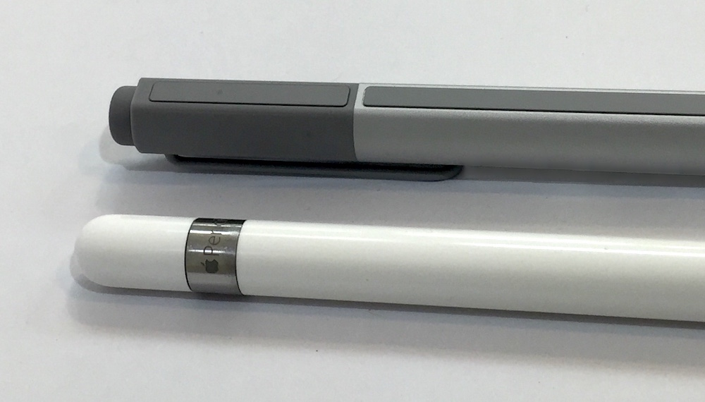 ◀iPad Pro用のApple Pencil(手前)は、滑らかな樹脂ボディを持ち、長めのペンシルに近いデザインがなされている。比較のために奥に置かれたSurface Pro 4用のSurface Penは、その名の通り、硬質な金属ボディでメカニカルなペンに近い印象だ。