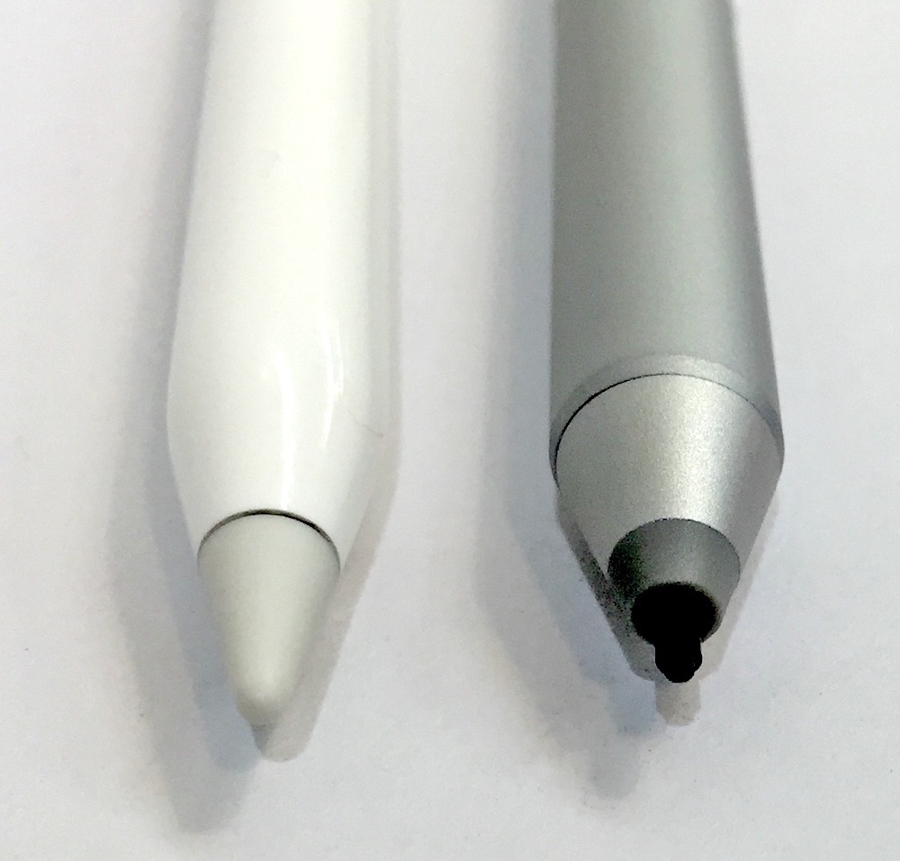 ◀同じく先端部を並べてみると、Apple Pencil(左)のほうがより鋭角的なフォルムだがソフトな印象に仕上げられている(ちなみに、どちらも磨耗時には交換可能な構造)。Apple Pencilの筆圧検知レベルは非公表だが、Surface Penが1024段階なので、同等の仕様は確保しているものと思われる。(クリックで拡大) |