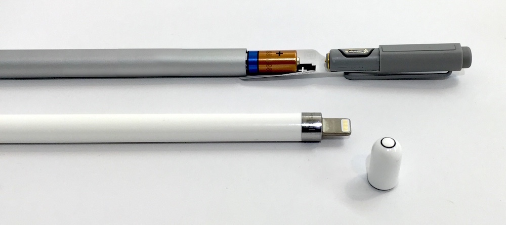 ◀電源も、Surface Pen(奥)は、やや入手しにくい単6乾電池であるのに対し、Apple Pencilは、Lightningコネクタを使った充電式で、iPad ProのLightningポートに挿してもリチャージできる。15秒の充電で約30分使用でき、フル充電状態ならば約12時間の連続使用が可能だ。(クリックで拡大) |