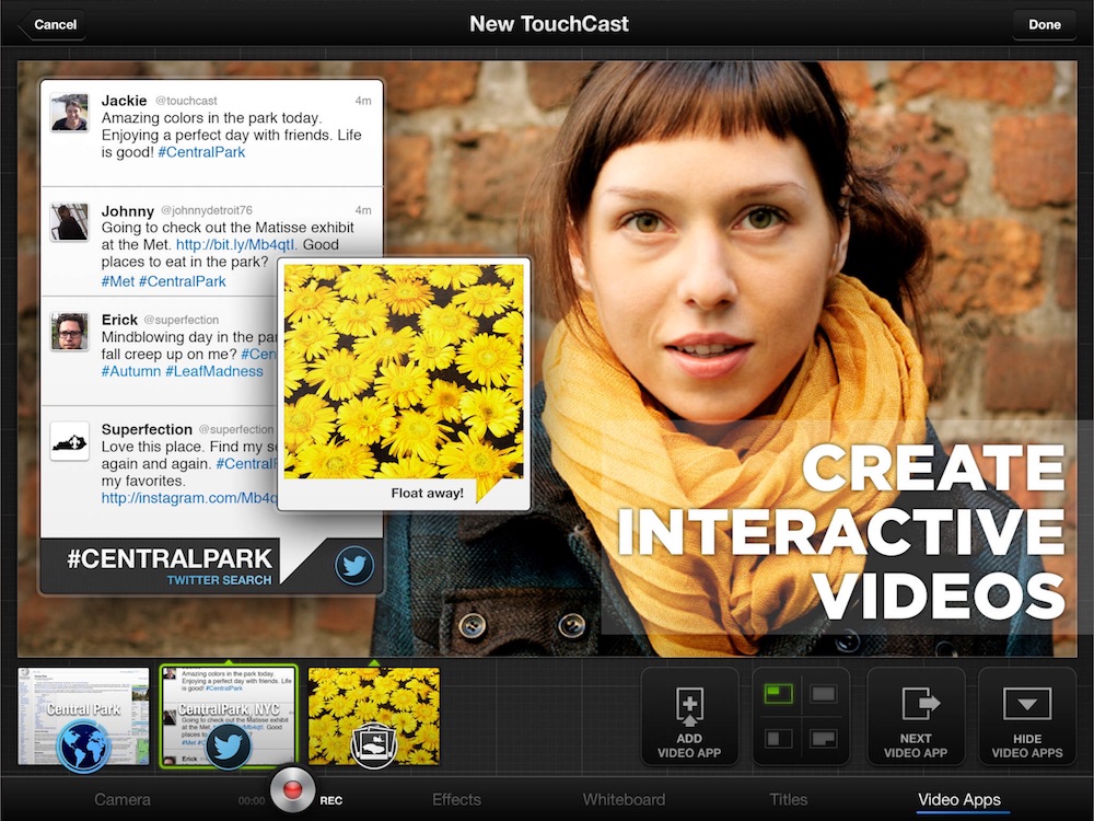 サードパーティ製のTouchCastは、ビデオ録画しながら、リアルタイムに静止画や動画、Webページなどを画面上に自由に呼び出して、それらに対する操作の過程ごとムービー化できるアプリ。TouchCastのシステム上でなら、インタラクティブな要素を残したまま配信することも可能だ。(クリックで拡大)