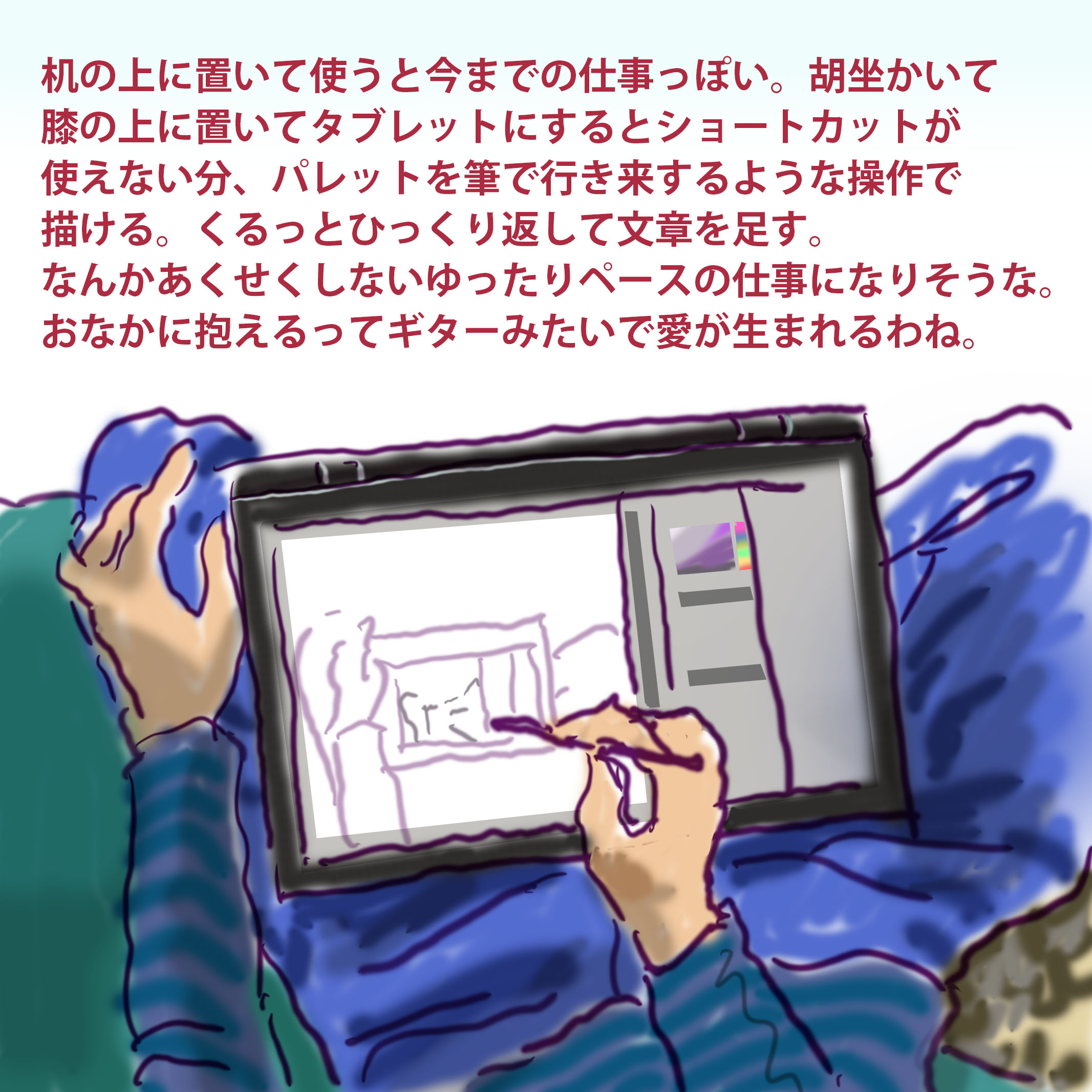 机の上のパソコンに向かう姿勢で使わずに、胡坐で膝の上に置くと、安定するし高解像度なモニタも見やすい距離になり親近感が増して嬉しくなってきた。ソファーが似合うやつなのか。マウスなしだから机に縛られずに肩こりしない姿勢かも。ヒンジを膝に当ててV字に置くとキーボードもペンも使える。