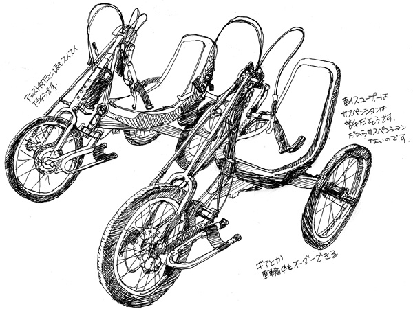 2012年、試乗したときはまさにプロトタイプ4台ができあがったタイミングだった。zenmonoをきっかけに販売開始、今6台を販売したところ。6歳の女の子にzenmonoで資金調達しつつ、無事先週岐阜まで納品したとのこと。購入者は健常者/障がい者半々、まさにバリアフリー。らくちんリカンベントみたいなものですもんね。