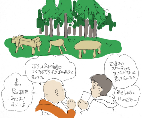 …と、ここまで1時間、私は別件があってこの場を離れました。そして夜。なんとキャンプ場のジンギスカン会場にちゃんと3種のスツールがあった! みんな座っている!! びっくりして参加していたYさんに聞くと、いろいろすごいコトがあったらしい。