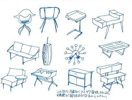 同じパーツ、モジュールを使うことで統一感やシステム拡張性、製造の合理化を狙った椅子、テーブル、キャビネット、ウォールシェルフ。コードがのたうつのを納めるスペースを作ったり。この人が最初なのか? 素直に"こんなのまだ世の中にないけど、こうしたらええやん"と思ったことを図にしてハーマンミラーに提示して、ストレートに製造に落とし込んでいったのか。スケッチもしゅっとした綺麗なものしか展示されてなくて、髪をかきむしって悶々、とかマエストロがぐしゃっと模型を潰す、みたいなどろどろは見えない、見せない。