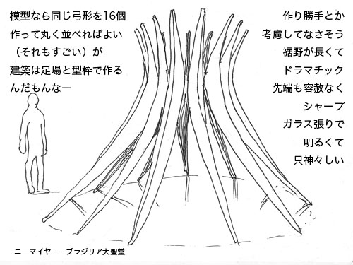 おそらくブラジリアの都市計画で60~70年代には丹下健三の代々木競技場、大阪万博パビリオン群のように、大曲面=明るい未来、文明の進歩、憧れの実現、かっこいい基準ができたのだろう。ああいうの自分も作りたい、と思う団塊の世代以前の人たち。