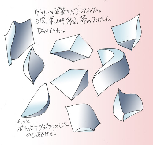 フランク・ゲーリーの仕事は、私がデザインを意識し始めた時期とタイミングが重なっていて、思い入れがある。斜めでも直交してなくても真っすぐでなくてもキレイな空間て存在するよ、破片の集合みたいでも建てられるよ気持ちよいよ、とそもそも思ったのがぶっ飛んでいる(脱構築主義)。