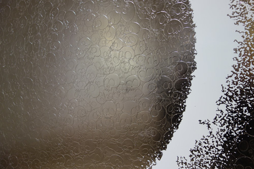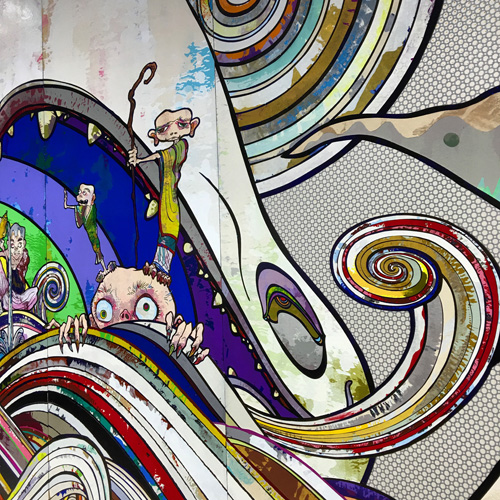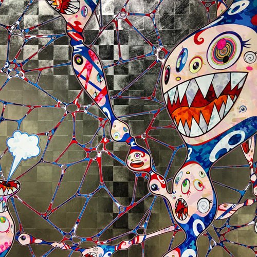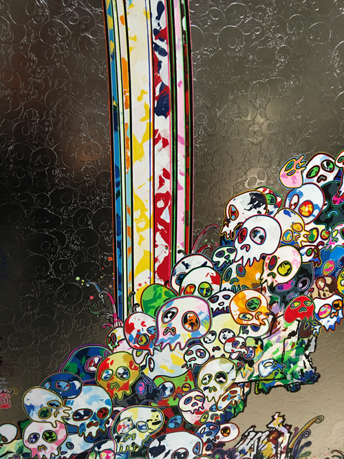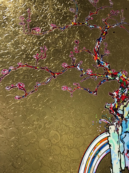 展示の目玉は高さ3メートル、全長100メートルの極彩色の超巨大絵画「五百羅漢図」だ。横山大観の「生々流転」など過去の絵画を研究し、現代の羅漢図を創り上げた。村上隆さんの絵画の仕上げの美しさに感動した。まるで螺鈿漆器のように細密で美しいことに注目するためマクロの画像を撮ってきた。