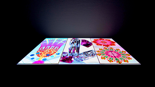 また一方でクリエイターが創造力を自由に遊ばせ、美しさを追求できる。枠がなく、11ミリの薄さ。自然光に近い光。発光面にはムラがない。表面にフィルムを貼るだけでなく平面印刷も可能。「特殊立体印刷」を施すことで油彩の凹凸や陰影まで、原画の細部を忠実に再現。Lightfaceの光を背面から受けて「光る絵画」に生まれ変わるデバイスを戸田正寿は「厚さ1センチぐらいの光る板が作れれば…」と執念で完成させた。