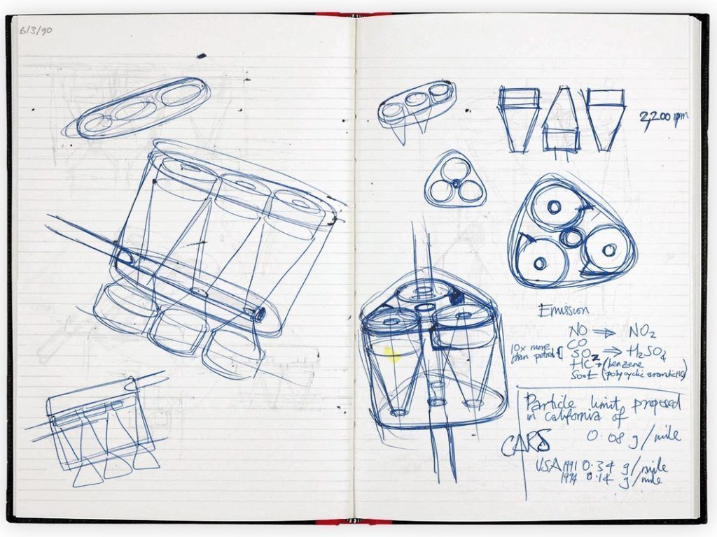 1990年からの図面(画像下)は、粒子を捕捉するために車両の排気系に取り付けることができるフィルタを示している。画像提供:ダイソン(肖像画のジェイムズ・ダイソン・ジェイ・ダイソン・ファンデーション)