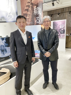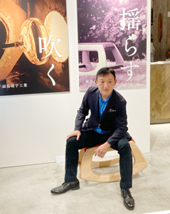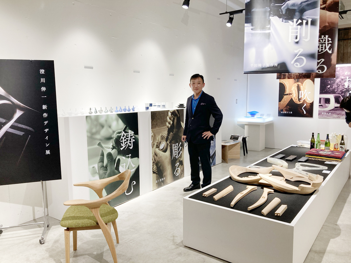▲澄川伸一新作デザイン展の会場と筆者。(クリックで拡大)