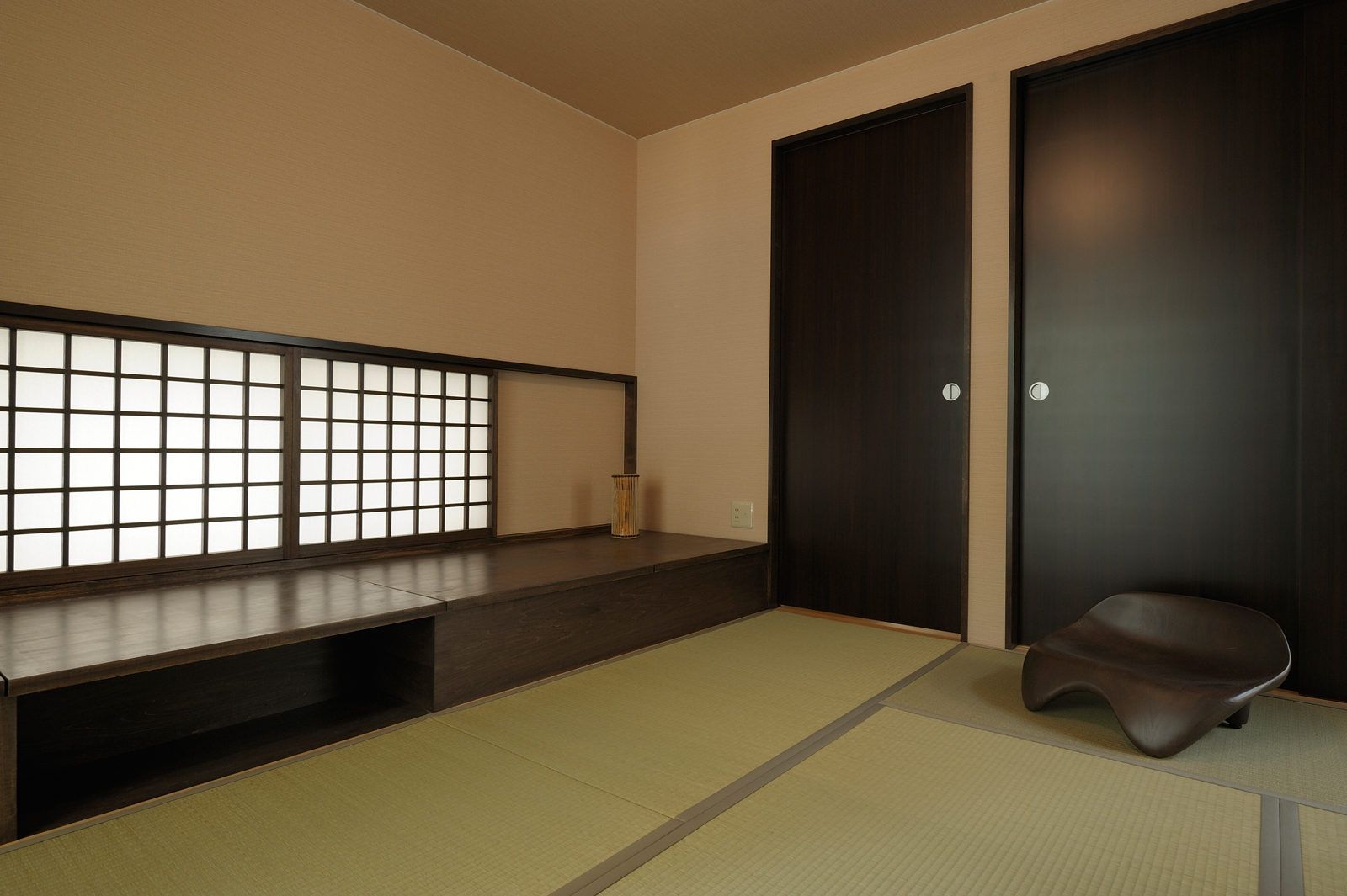 ▲「著者の寝室」。天井高を通常より低く、2,200mmに抑えて、エアコンの効きを効率的に行うように設計。窓は、全開放でき、遮光も完全にできるような木製の引き戸を設置。腰掛としても使える高さの物入れは、その1つを開くと事務所に直結する梯子の通路が忍者屋敷のように隠されている。夜中にふとアイデアが閃いた時に鮮度を保ったまま作業ができ重宝している。(クリックで拡大)