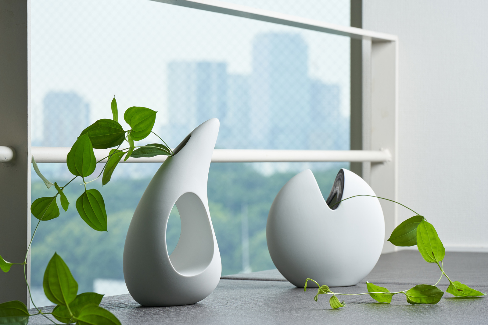 「石と水」(伊万里焼/青山窯) 現代彫刻として部屋のインテリアのアクセントになるオブジェですが、実は花器としても使えるデザインです。散歩の途中で近くの雑草ですら、ちょっと差し込むだけで気持ちが落ち着きます。さりげなさと、日常のちょっとした一工夫で、空気感は一変します。伝統産業でありながら、CADで曲面設計しています。(クリックで拡大)
