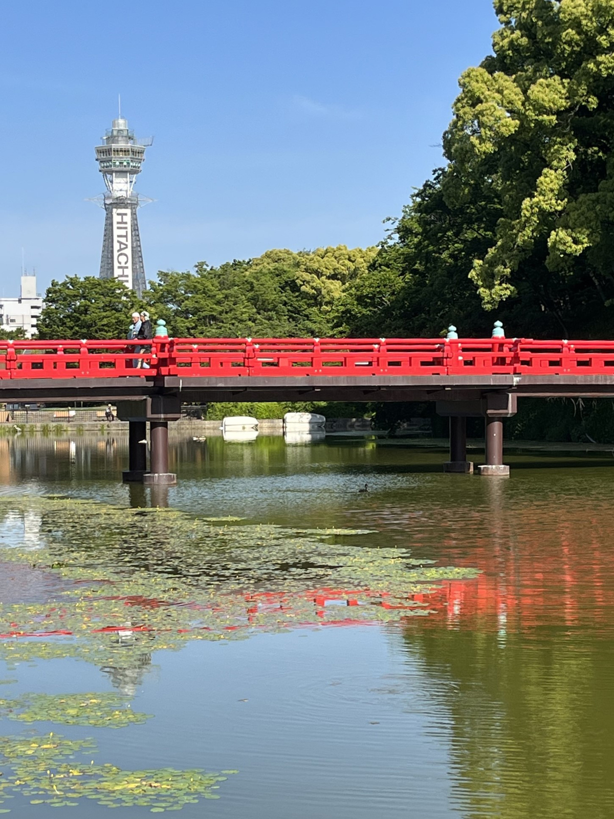 ▲てんしば公園の奥に位置する大きな池。奥に通天閣が見える。(クリックで拡大)