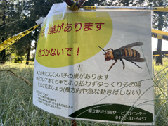 ▲毎朝のジョギングコースにもスズメバチの巣の注意喚起が。(クリックで拡大)