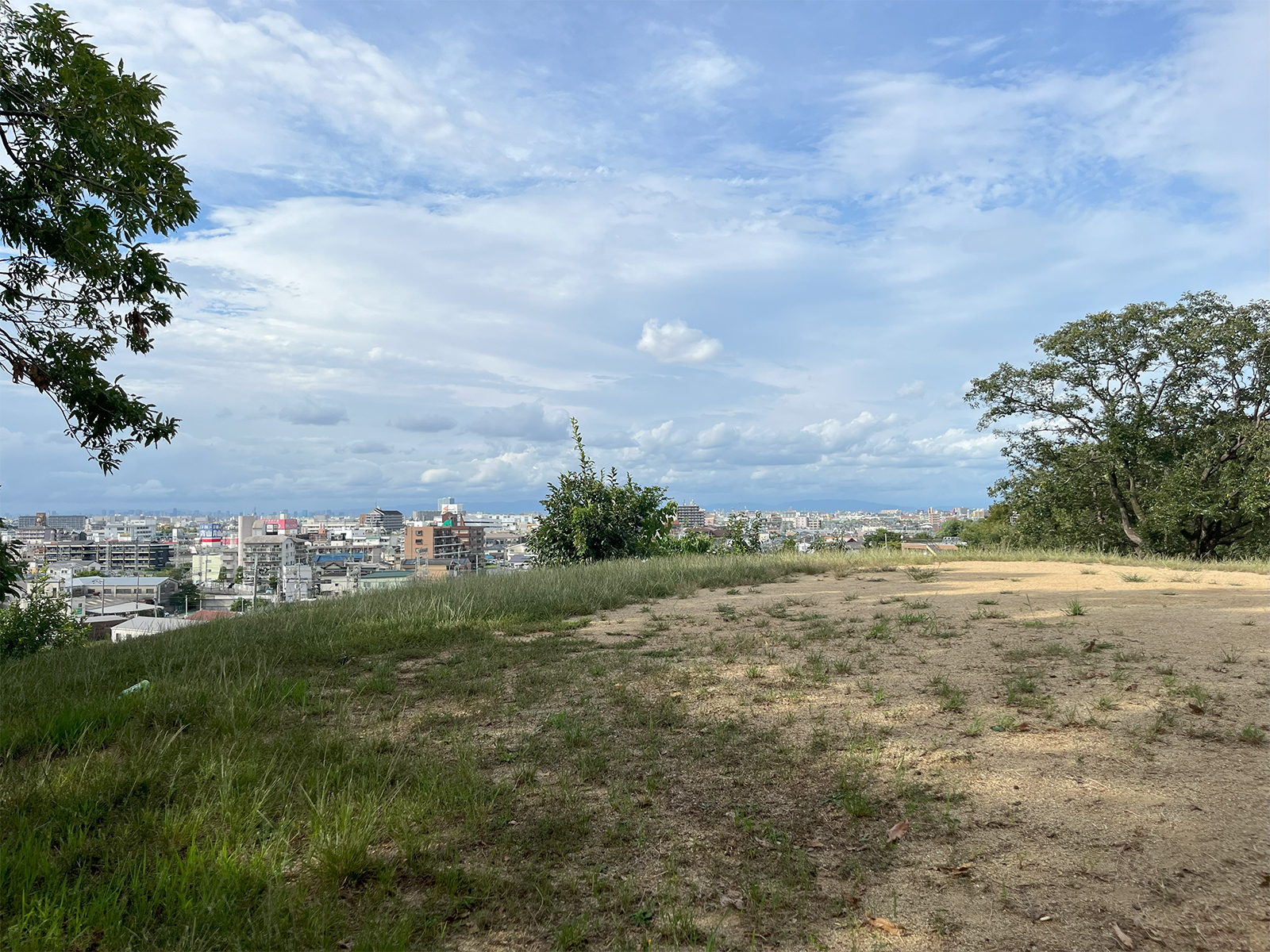 ▲古墳の中にはこんな感じで頂上まで自由に登れるものもある。ちょっと高度が上がったでけで天王寺のハルカスまで見える。当時はたくさんの古墳も見えていたのだろう。(クリックで拡大)